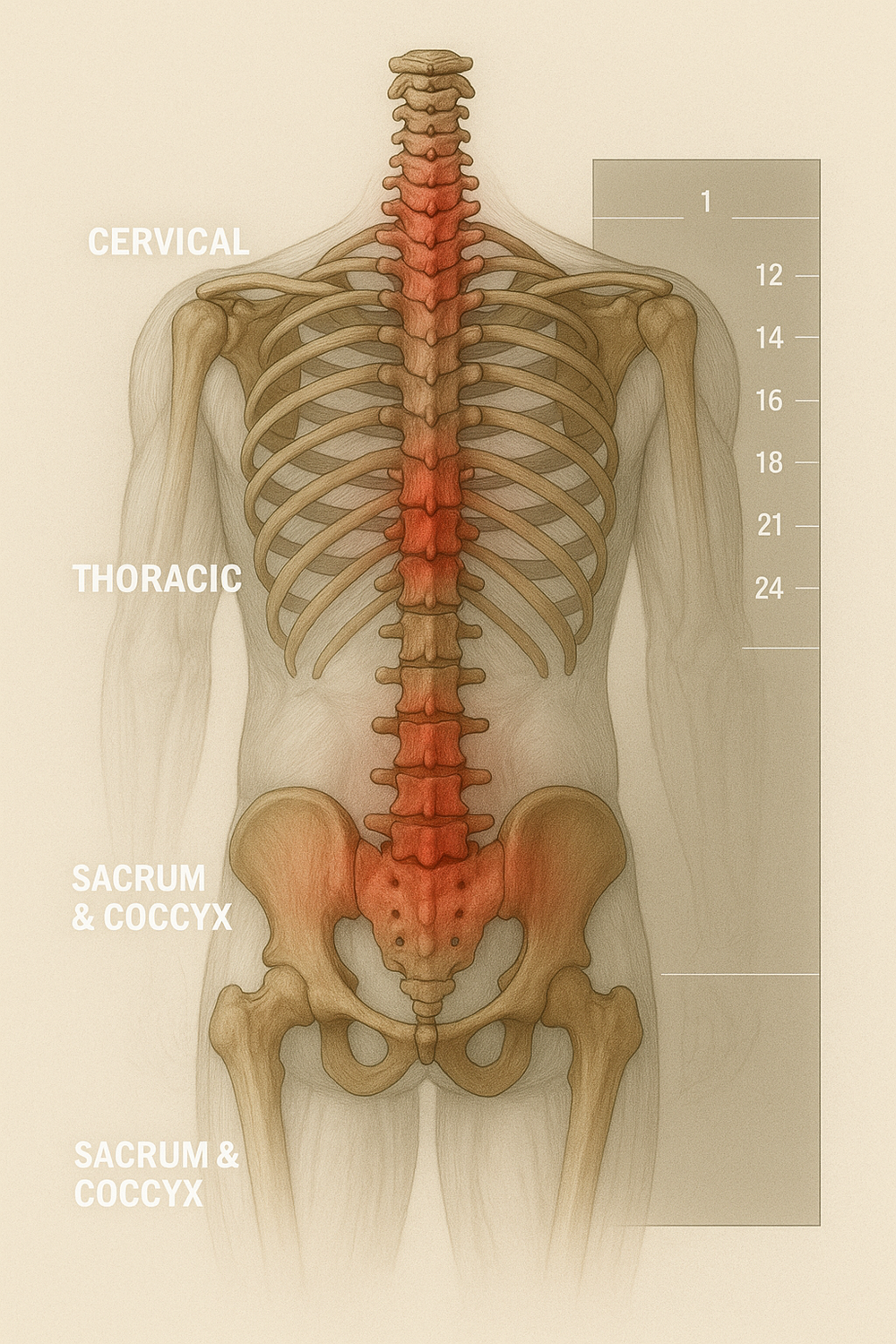 Over the coming weeks, we’ll explore each spinal section in detail — from the C1 Atlas to the Coccyx — explaining: